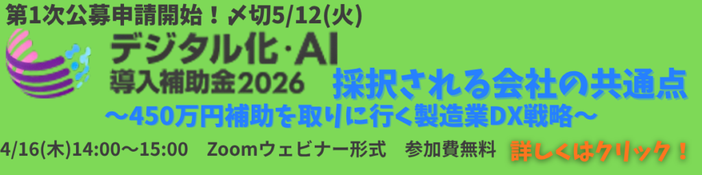【4/16(木)14時~ オンラインセミナー開催のお知らせ】第1次公募申請開始! 〆切5/12(火)「デジタル化・AI導入補助金2026」採択される会社の共通点 ~450万円補助を取りに行く製造業DX戦略~