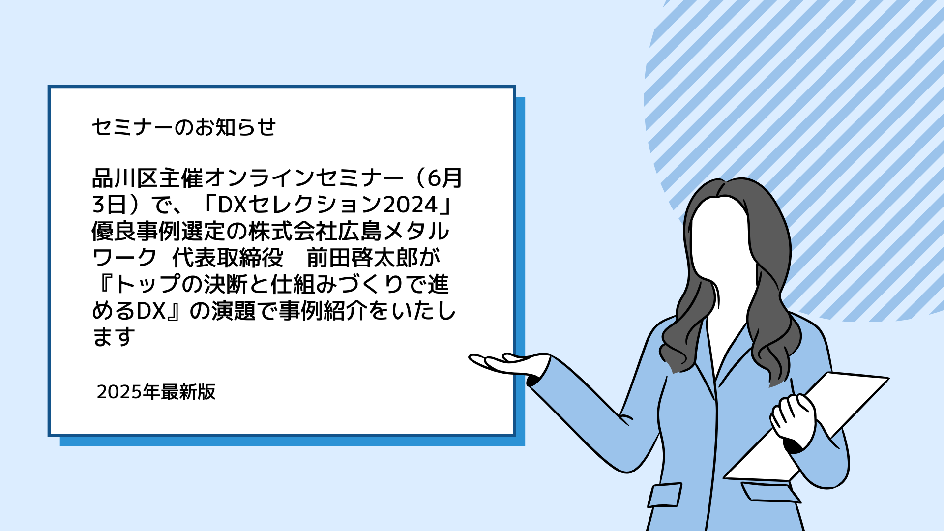 品川区主催オンラインセミナーで、「DXセレクション2024」優良事例選定の株式会社広島メタルワーク 代表取締役 前田啓太郎が『トップの決断と仕組みづくりで進めるDX』の演題で事例紹介をいたします
