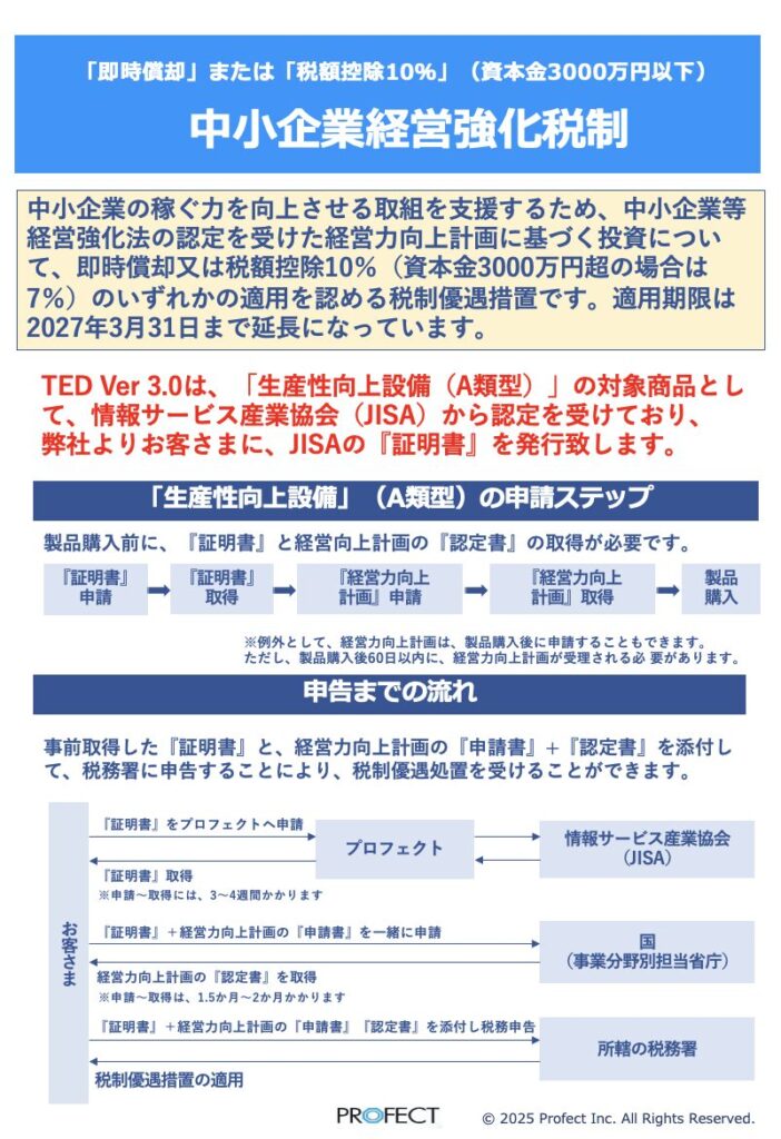今こそ、中小企業経営強化税制を活用し、プロフェクトの生産管理システム「TED」とともに、未来に向けた力強い一歩を踏み出しましょう。