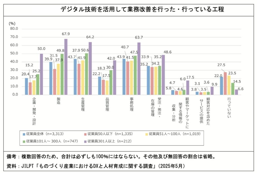 ものづくり企業において、デジタル技術を活用した業務改善の状況について見ると(従業員規模問わず全体)、「事務処理」で43.9%、「生産管理」で43.7%、「製造」で39.9%、「受注、発注、在庫の管理」で35.2%と、3割強から4割強の企業が実施しているという調査結果でした。一方、「企画・開発・設計」では20.4%、「品質管理」では22.4%と、2割程度しかデジタル技術を活用した業務改善ができていないことがわかりました。
