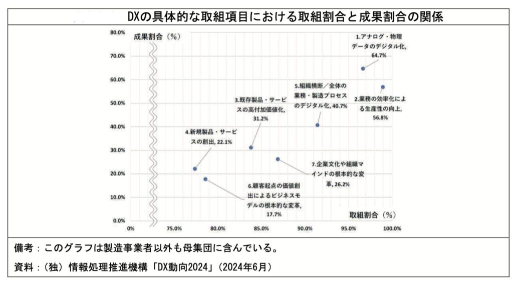 DXの具体的な取組項目における取組割合と成果割合の関係に関する調査によると「アナログ・物理データのデジタル化」、「組織横断/全体の業務・製造プロセスのデジタル化」及び「業務の効率化による生産性の向上」には90%超の企業が取り組み、40%超が成果を創出しています。他方で、製品・サービスの創出や高付加価値化、ビジネスモデル、企業文化及び組織マインドの変革には80%前後の企業が取り組んでいるものの、成果割合は20%前後にとどまり、成果になかなか結び付いていないことがうかがえます。