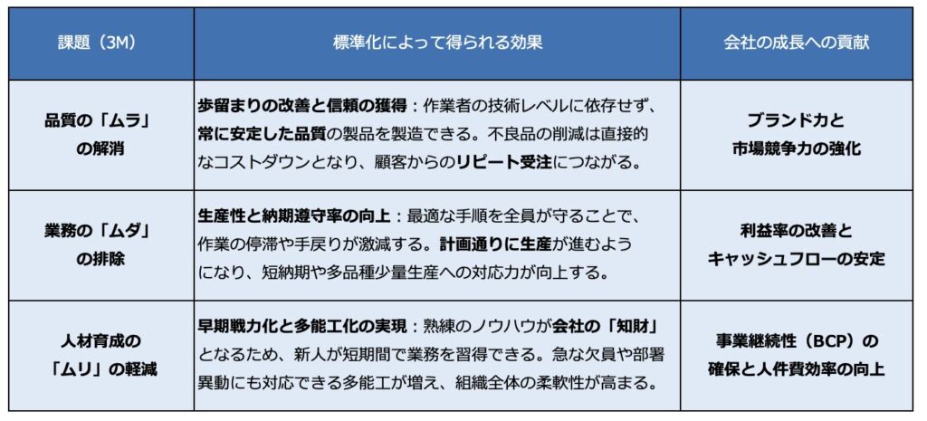標準化の本質は、マニュアル作りではない 。それは、「最善のやり方を見える化し、それを全員で共有し、さらに良くしていくための仕組み」を作ることにある 。この仕組みが、中小製造業が抱える根深い課題、「3M」(ムリ・ムダ・ムラ)を一掃し、確実に利益体質へと変貌させる 。