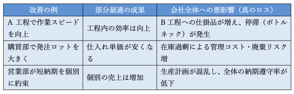 KAIZEN三四郎: 部分最適とは、一部の部署や工程だけを局所的に改善することだね。例えば、ツクル君の会社でもこんなことはないかい?