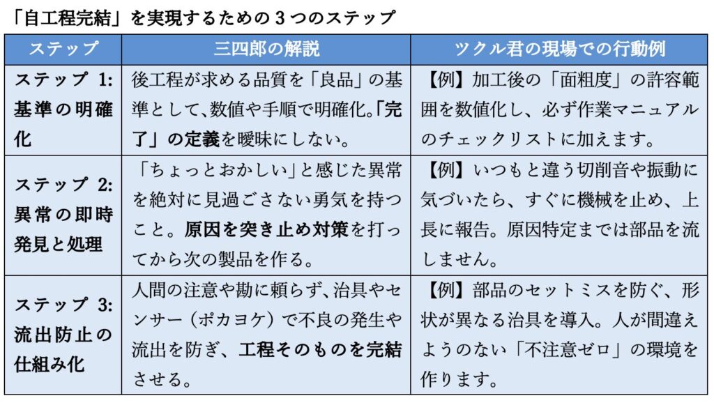 ツクル: 特にステップ2の「異常の即時発見と処理」が「完結」の肝ですね。不良の可能性を残したまま次の工程に流してしまうのは、「自分の仕事を完結させていない」ということだと理解できました。