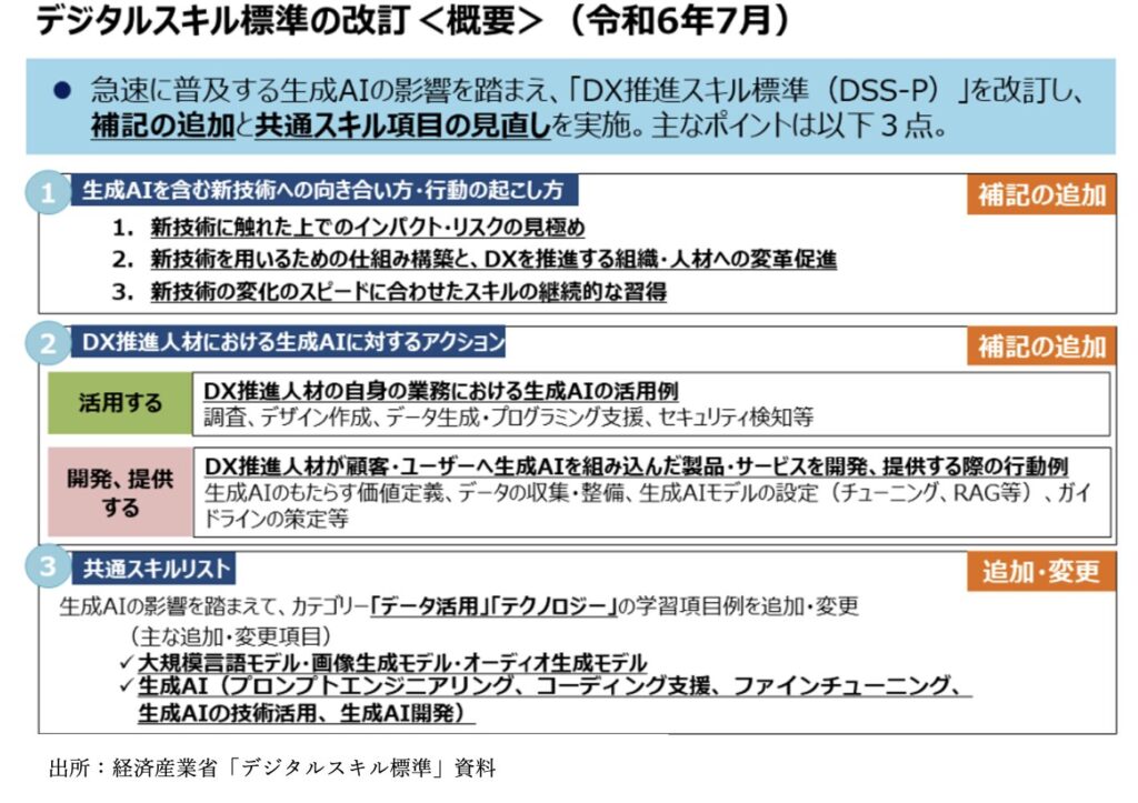 生成AIの登場や進化によって、DXに関わるビジネスパーソンに求められるスキルも変化していることを踏まえ、DX推進スキル標準(DSS-P)が2024年7月に改訂されました。