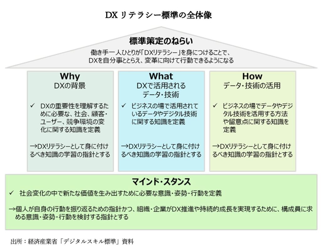 これは、企業がDX(デジタルトランスフォーメーション)を推進するために、すべての人材に求められるスキルやマインドを明確に定義した、いわば「DX時代のスキルマップ」です。