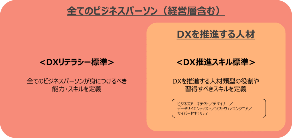 デジタルスキル標準(DSS)は、ビジネスパーソン全体がDXに関する基礎的な知識やスキル・マインドを身につけるための指針である「DXリテラシー標準(DSS-L)」、及び、企業がDXを推進する専門性を持った人材を育成・採用するための指針である「DX推進スキル標準(DSS-P)」の2種類で構成されています