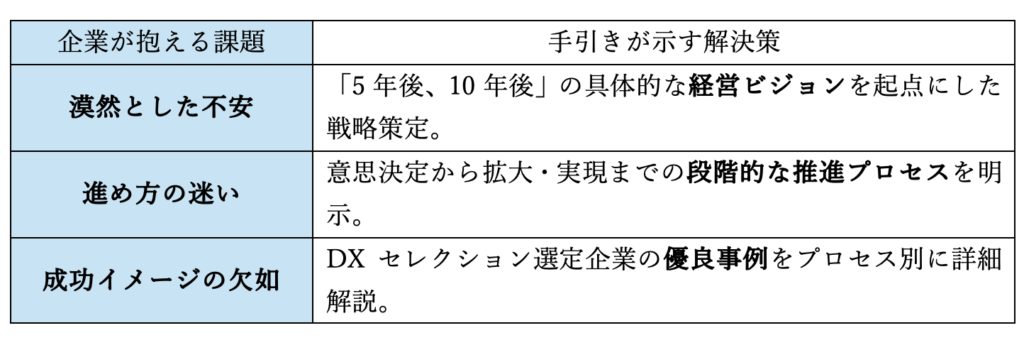 この手引きは、DXに悩む企業が直面する主要な課題に対し、明確な道筋を示しています。