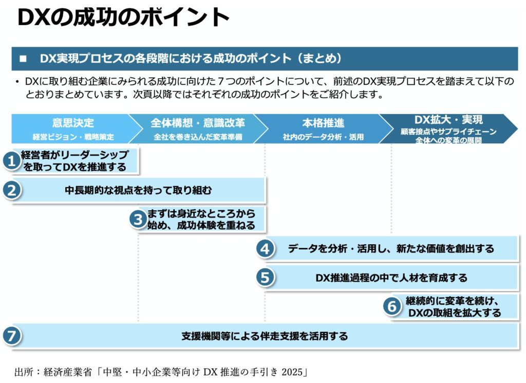 手引きが特に強調するのは、デジタル技術の導入そのものよりも、企業文化や経営者のマインドセットの変革です。DXを成功に導くための「7つのポイント」には、以下のような、中堅・中小企業ならではの視点が盛り込まれています。