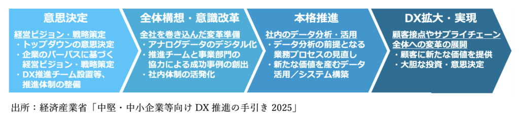 経済産業省は、上場企業のモデルケースである「DX銘柄」選定企業等の成功事例を基に、以下の4段階のDX実現プロセスを示しました。これは、大企業や上場企業等も含めた多くの企業を対象に一般論として提示されたものであり、中堅・中小企業等がDX推進に取り組む際においても重要なプロセスです。