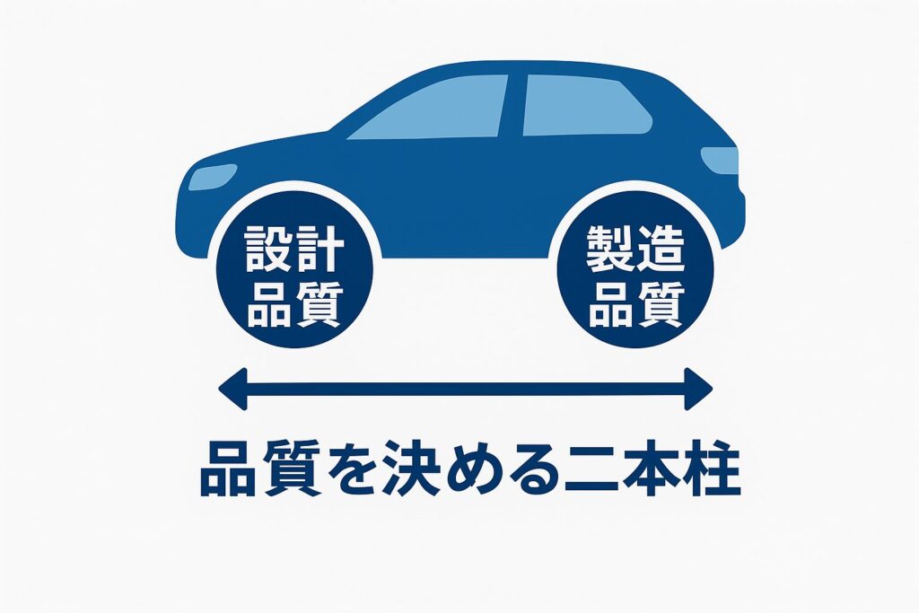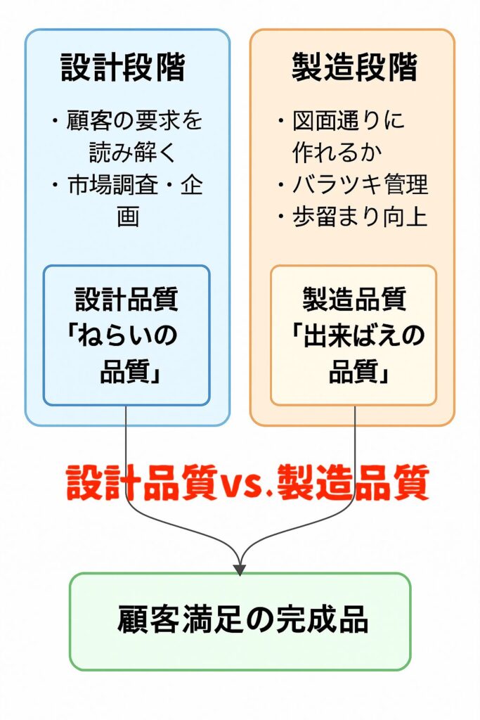 KAIZEN三四郎: この顧客の要求に応える「品質」は、製品が出来上がるまでに、大きく分けて二つの段階で決まるんじゃ。これが「設計品質」と「製造品質」じゃ。この二つが車の両輪のように機能して、初めて顧客の手に渡る製品の品質が定まるんじゃよ。