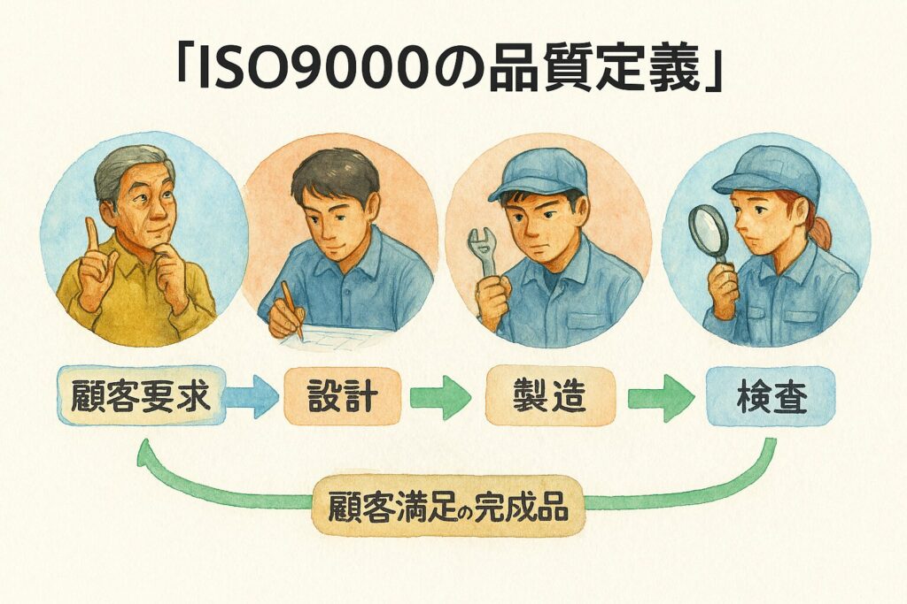 KAIZEN三四郎: その通り!実はこの定義は、品質マネジメントシステムの国際規格である「ISO 9000」シリーズでも中核となっている考え方なんじゃ。ISO 9000では「品質」を『対象に本来備わっている特性の集まりが、要求事項を満たしている程度』と定めている。つまり、私たちが今話している「顧客の要求」とは、この規格が最も重要視していることなんじゃ。