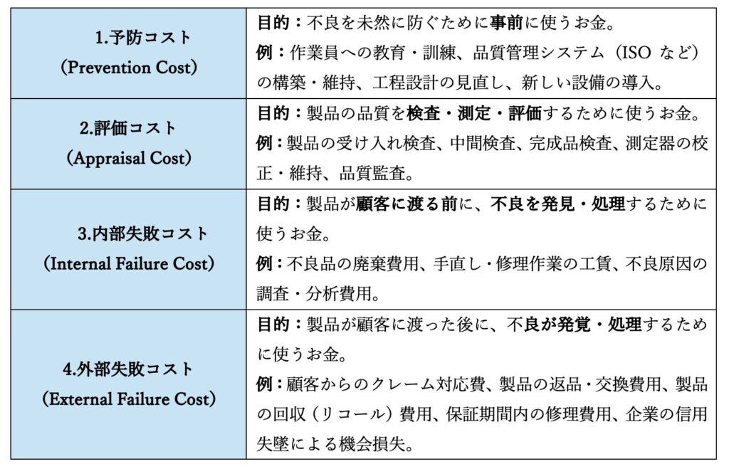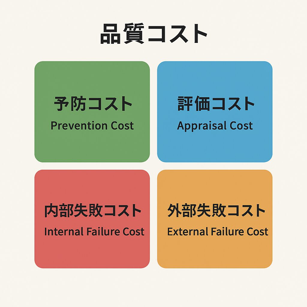 KAIZEN三四郎: この品質とコストの関係を定量的に把握し、管理するために、「品質コスト」という考え方がある。これは、企業が品質に関わる活動に費やした費用を、その発生原因によって分類したものじゃ。この分類は、品質管理の分野で広く用いられる「PAF法(Prevention-Appraisal-Failure法)」というモデルに基づいており、伝統的には次の四つに分類される。