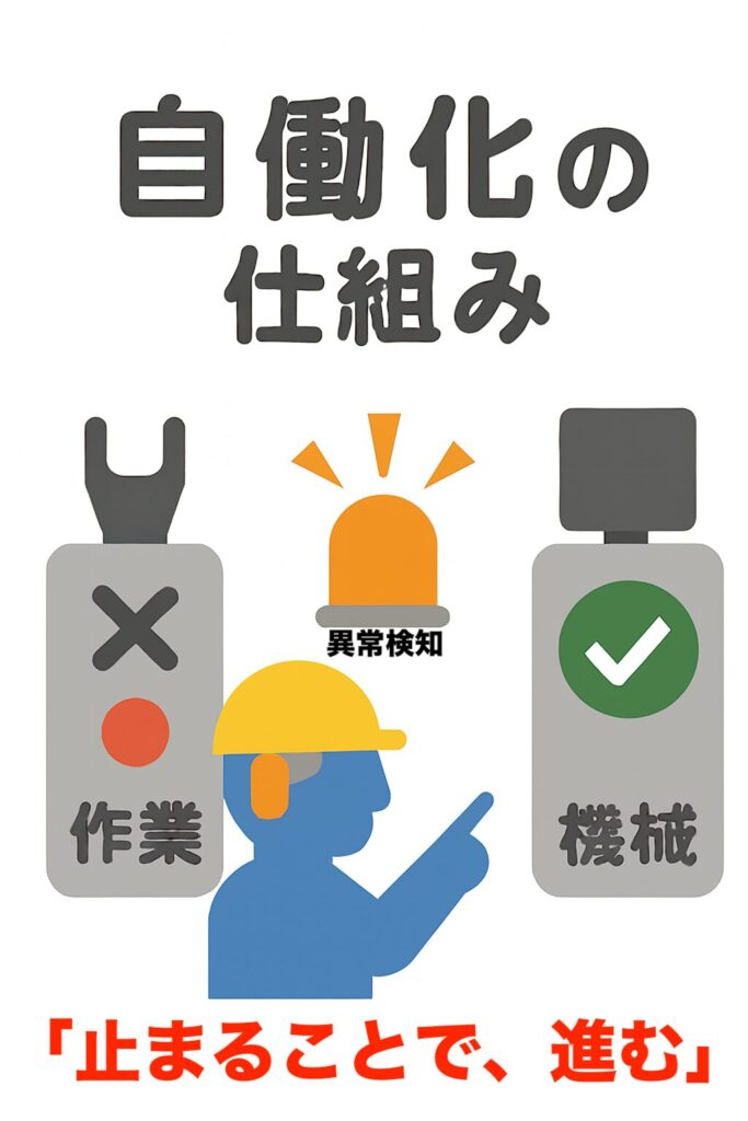 機械が不良品を感知したら自動で停止し、人間に品質問題の解決と工夫を促す機能を持たせること。機械は人間の補助的な役割であり、品質問題の解決は人間が担うという、TQCの考え方 。