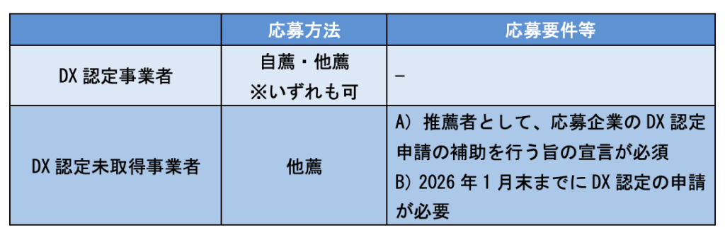 DX認定事業者、DX認定未取得事業者によって、以下の通り応募要件が異なります。DX認定制度については関連リンクをご参照ください。