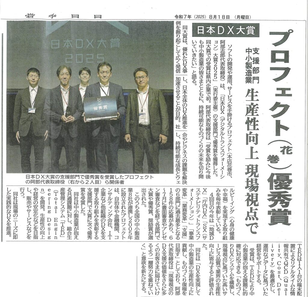 【メディア掲載のお知らせ】2025年8月18日の「岩手日日新聞」に、プロフェクトが『日本DX大賞2025』の優秀賞を受賞した記事が掲載されました 2025 9/09 お知らせ メディア掲載 2025年8月19日2025年9月9日 出所:岩手日日新聞2025年8月18日付け記事、岩手日日新聞社の許諾を得て転載しています お知らせ メディア掲載 日本DX大賞、優秀賞、支援部門、受賞、中小製造業、生産性向上、現場視点、ものづくりDX、QCDの最適化 この記事が気に入ったら いいね または フォローしてね! Follow @PROFECT_TED よかったらシェアしてね! URLをコピーしました! URLをコピーしました! コメント コメントする コメントをキャンセルコメントを投稿するにはログインしてください。