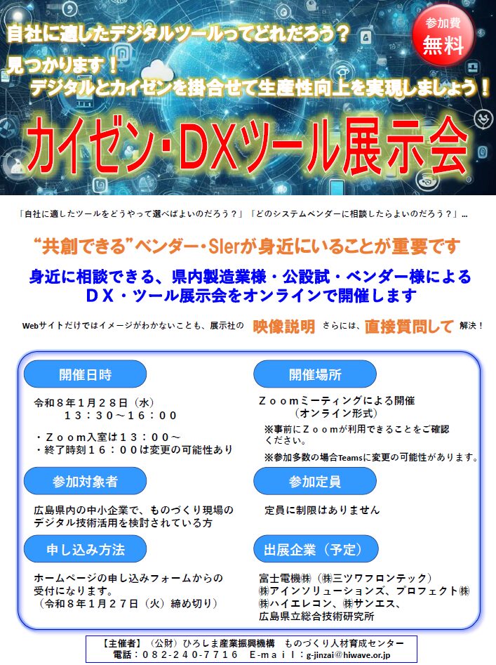 【公益財団法人ひろしま産業振興機構主催】2025年度 カイゼン・DXツール展示会のお知らせ