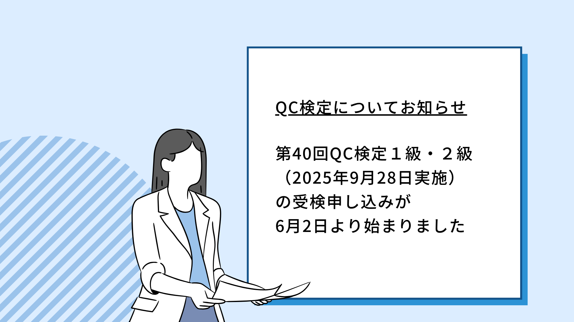 第40回QC検定(2025年9月28日実施)の1級・2級について、6月2日より受検申込受付を開始いたしました。   なお、文末に、1級・2級のレベル表と各級の問題例を紹介したサイトを添付しておりますので、ぜひ、参考になさってください。