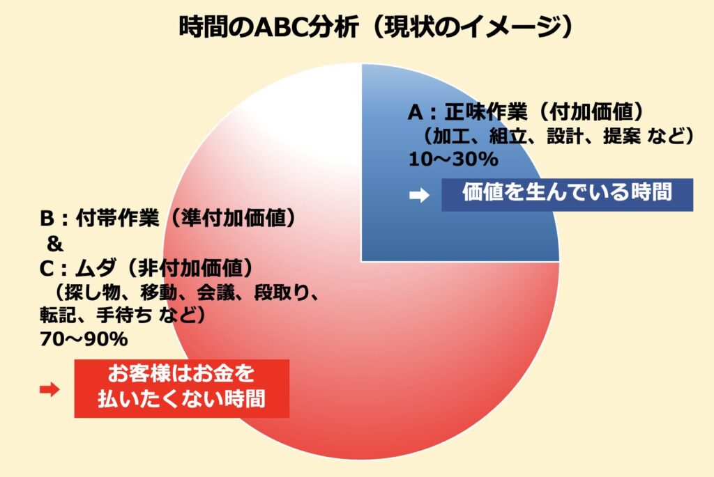 そうだ。多くの中小企業の実態は、A(正味作業)が全体の10〜30%程度しかないと言われている。残りの7割以上は、お客様にとって本来お金を払いたくない時間に費やされているんだ。