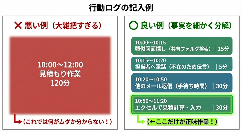 ああ。「10:00〜11:00 見積作成」みたいな大雑把なものではダメだ。「見積作成」の中身を分解しろ。「10:00〜10:15 過去の類似図面を探す」「10:15〜10:30 最新単価を調べるために電話」「10:30〜10:45 エクセルへの入力作業」……といった具合にな。