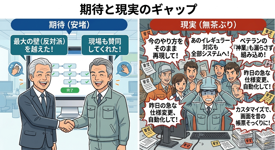 一見、現場に寄り添った正当な意見に聞こえます。 しかし、この要望をすべて鵜呑みにすることが、システム導入を「高コストな失敗」へと導く最大の要因なのです。