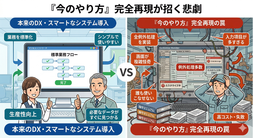 機能は雪だるま式に膨れ上がり、カスタマイズ費用は天井知らず。出来上がったシステムは入力項目だらけで、マニュアルは分厚くなり、結局「誰も使いこなせない巨大なゴミ」が完成してしまいます。