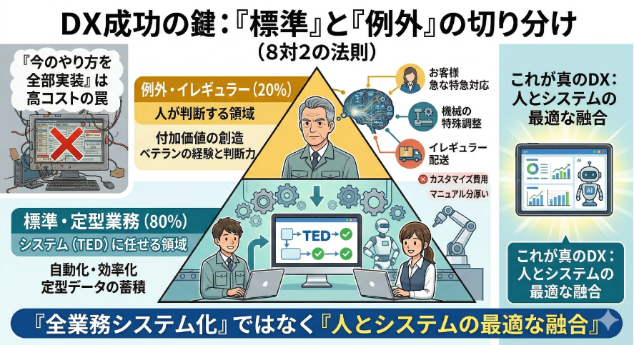 システム導入の目的は、属人的な神業をシステムにコピーすることではありません。 「8割の定型業務をシステムに任せ、人は2割のイレギュラー(例外処理)に集中すること」です。