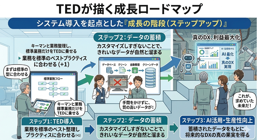 システムに合わせて業務を標準化することで、初めて「データ」が綺麗に蓄積され、将来的なAI活用や生産性向上の道が開けます。